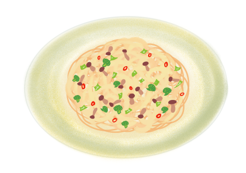ガーリックをあえて使わない安心ペペロンチーノは不思議にんにく風味、もっちり太めのスパゲッティで。